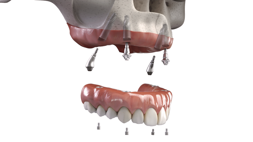 All-on-4: uses 4 implants to support a complete arch. It is ideal for cases where there is a good amount of bone and allows for less invasive surgery.